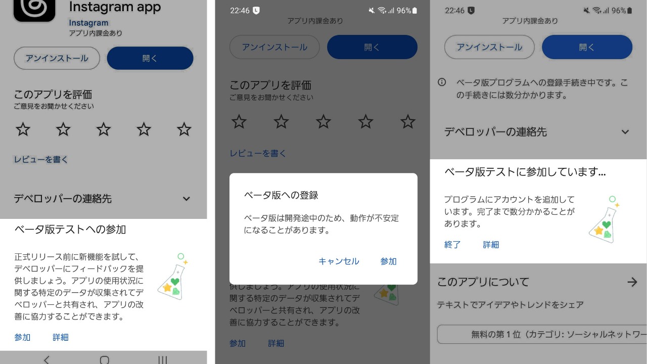 ベータプログラムに参加したい場合は、画像のようにPlayストアの下部ある参加ページに進むことで簡単に参加できます。