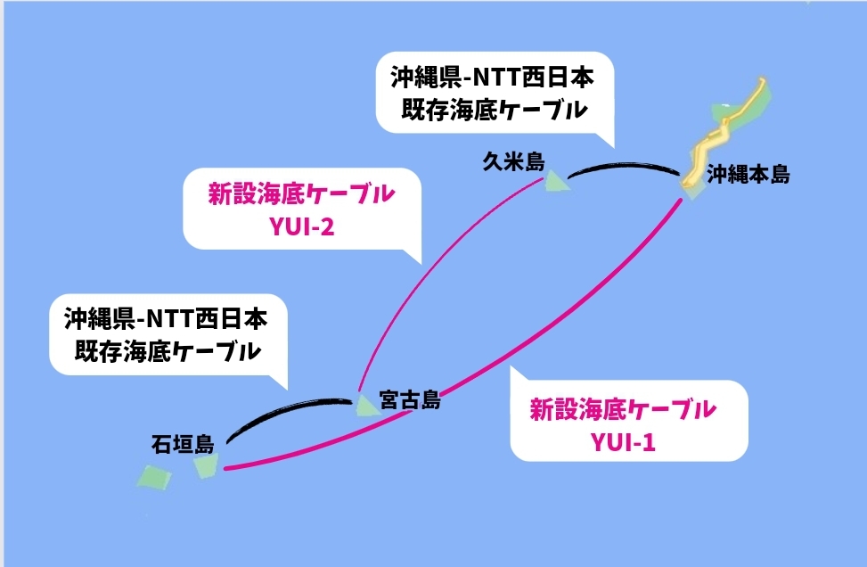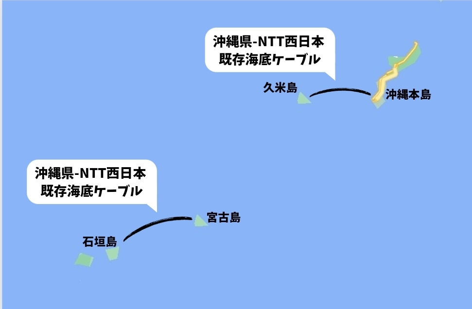 従来は石垣島~宮古島、久米島~沖縄本島の2区間をNTT西日本と沖縄県が保有する既設の海底ケーブルで結んでいたが、ここから更に2区画を追加して4島を結ぶネットワークを整備するという取り組みであった。